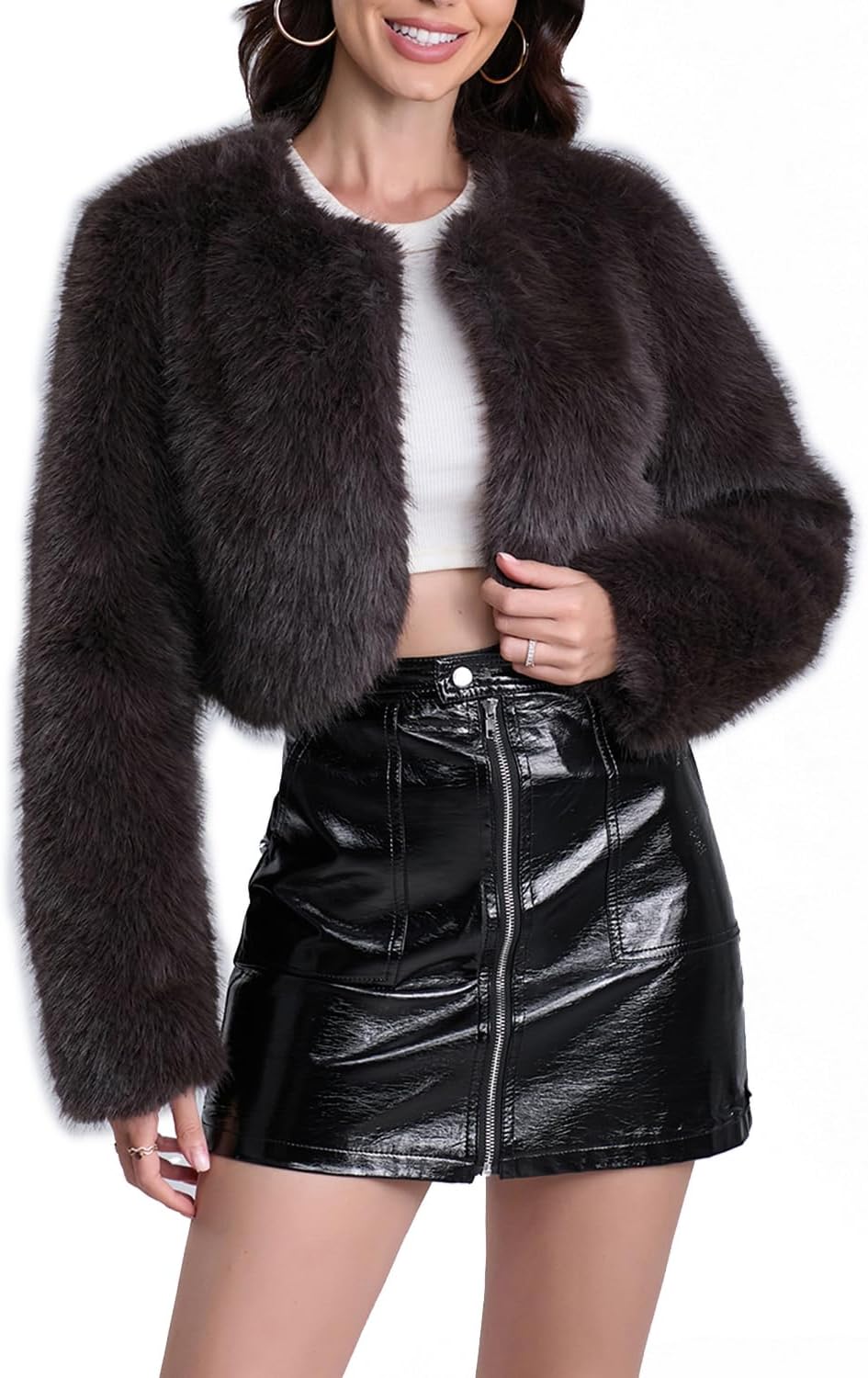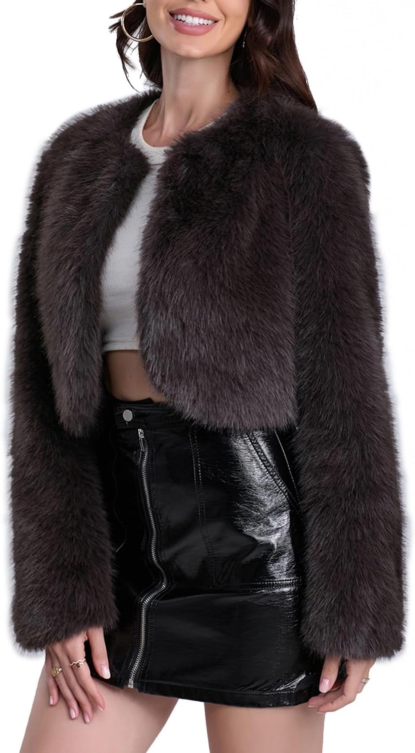 Women’s Faux Fur Cropped Coat Long Sleeve Open Front Winter Jacket